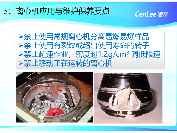 禁止使用常規離心機分離易燃易爆樣品;禁止使用有裂紋或超出使用壽命的轉子;禁止超速作業,密度超1.2g/cm3 ,需要調低限速;禁止移動正在運轉的離心機